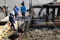 川幅の広い天塩川では、定置網の漁法が用いられています。日の出ごろ漁師たちは船で漁へと向かい、仕掛けた網を引き上げに向かいます。
